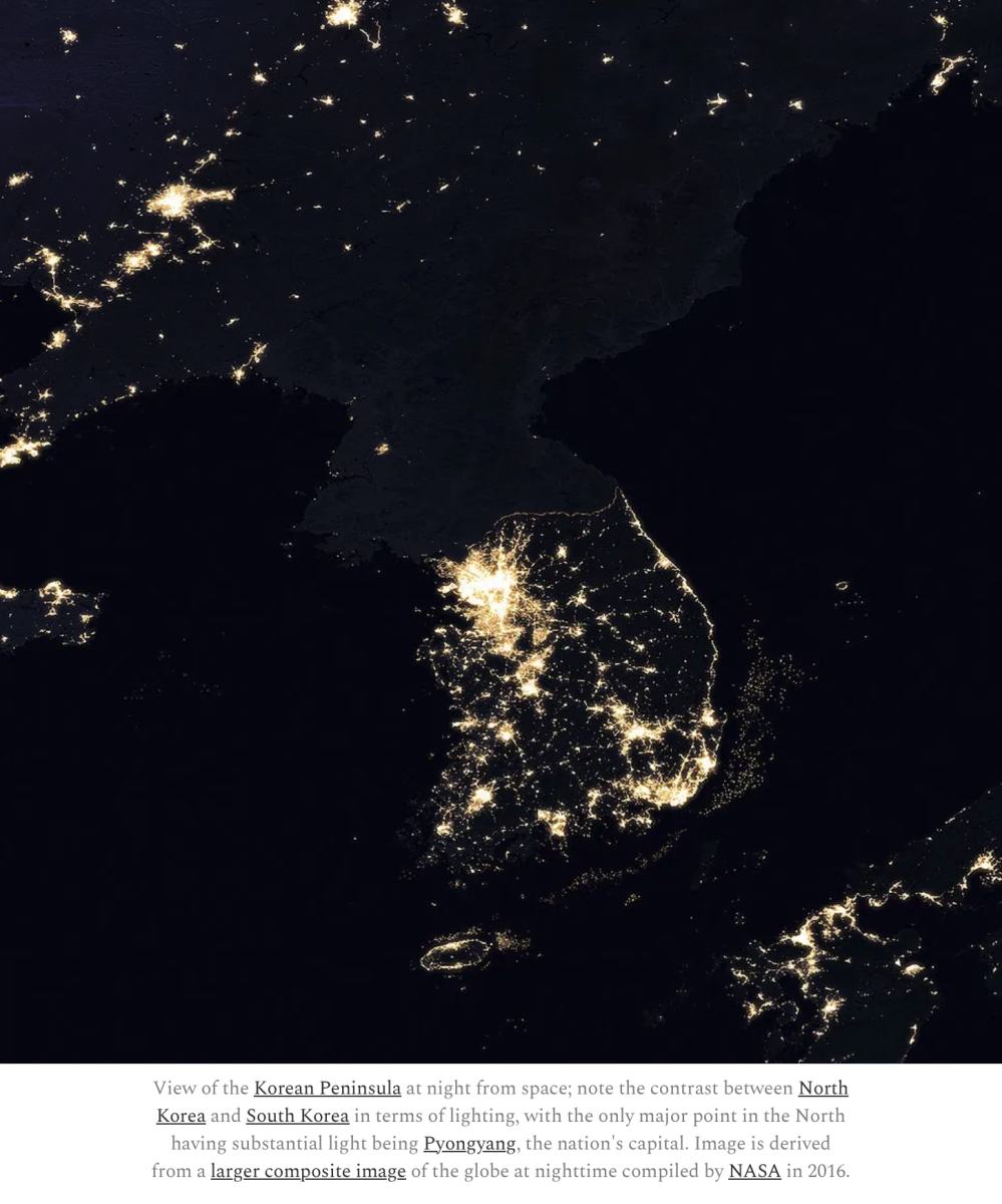 Korean War veterans and others frequently cite a NASA photo of the Korean peninsula at night, showing an illuminated South Korea and North Korea in darkness except for around the capital of Pyongyang.